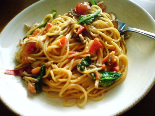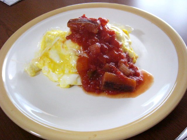 ソースは茄子のトマト煮。トマト缶と茄子とピーマンとタマネギで構成されてます。