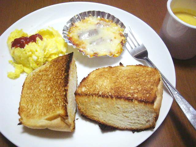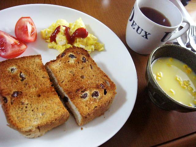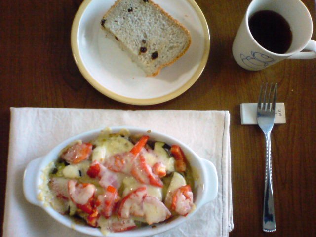 スクランブルエッグ、茄子のトマト煮のチーズ焼き、トースト(冷凍してたパン)、カボチャのポタージュ、写ってないけど梨