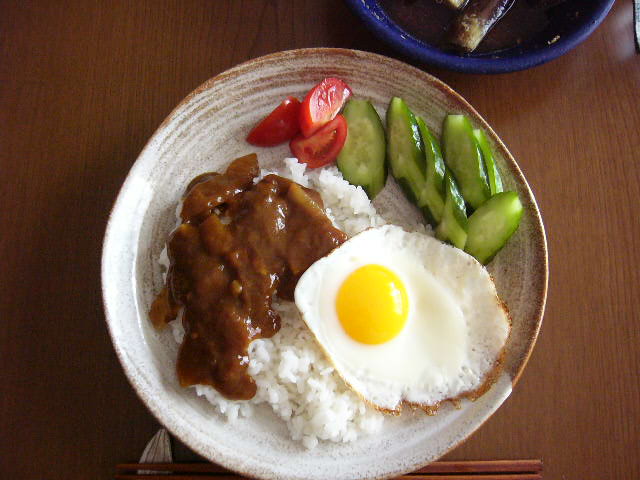 昨夜の揚げ茄子、トマト、キュウリ、カレー、白米、目玉焼き