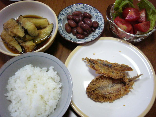 揚げ茄子、金時豆の甘煮、サラダ菜、トマト、白米、小イワシのフライ、写真に写ってないけど冷奴