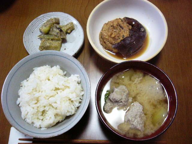 茄子の胡麻和え、がんもの煮物、七分つき米、つみれの味噌汁