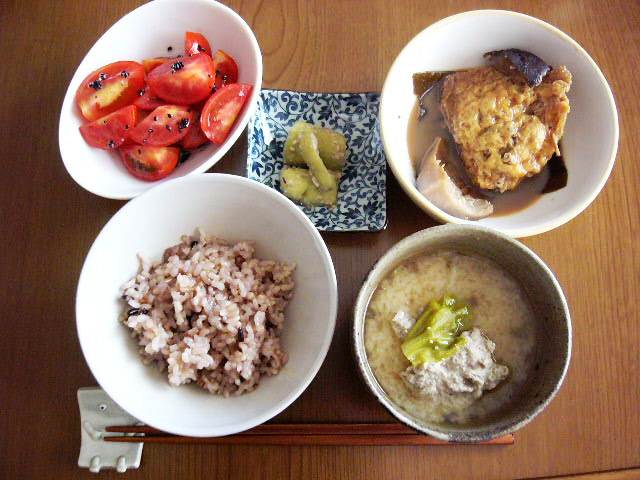 トマト、茄子のゴマ味噌和え、あぶ玉、雑穀入り玄米、つみれの味噌汁