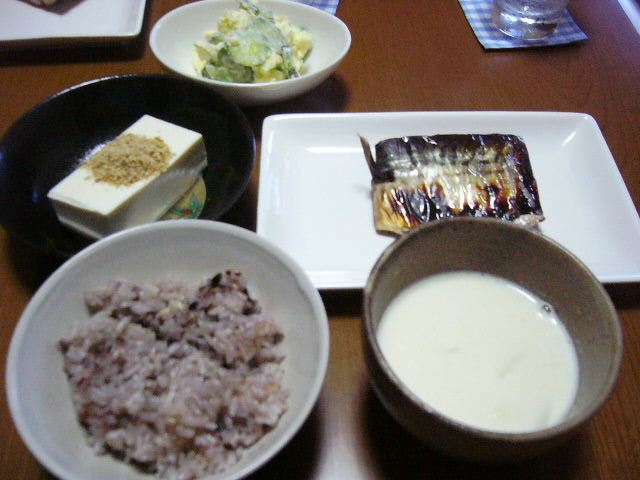 ポテトサラダ、冷奴、さばみりん、雑穀入り七分つき米、シチュー