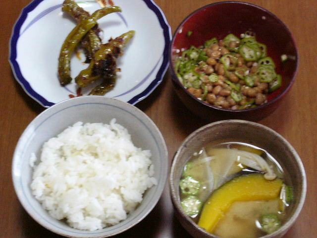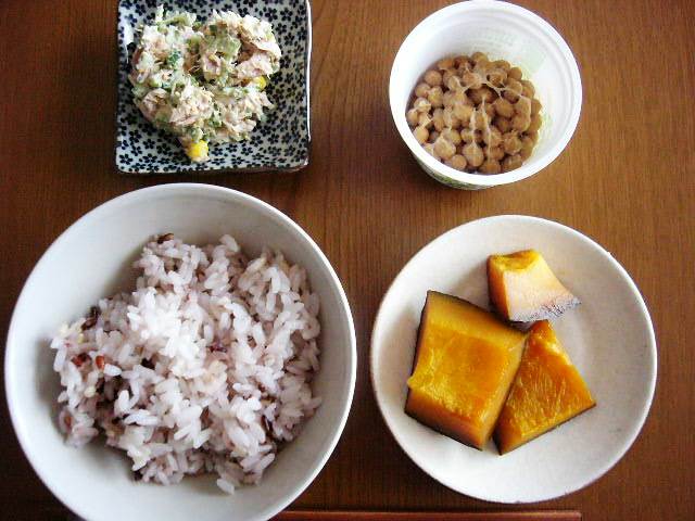 ゴーヤのツナゴマ和え、納豆、雑穀入り白米、かぼちゃの煮物