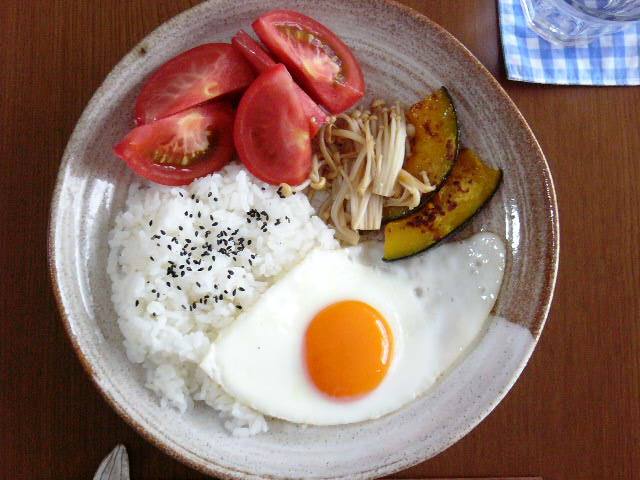 トマト、焼肉のたれでえのきを炒めたもの、かぼちゃ、白米、目玉焼き