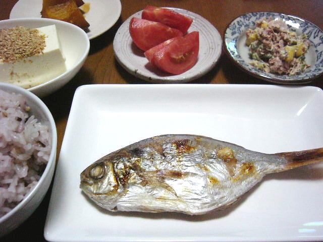 カボチャの煮物、冷奴、トマト、ゴーヤのツナゴマ和え、雑穀入り白米、干物