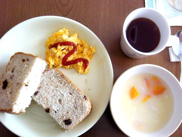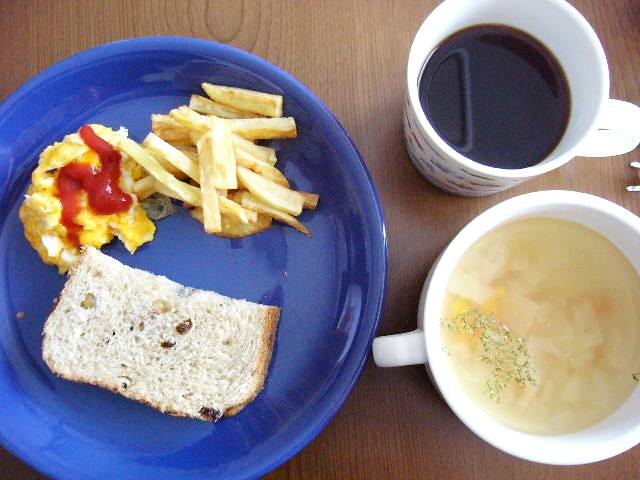 スクランブルエッグ、フライドポテト、レーズンと胡桃入りパン(HB)、野菜スープ、珍しくコーヒー
