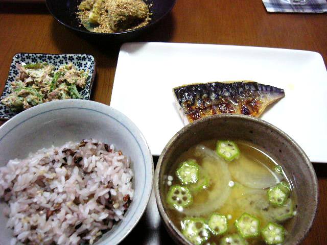 焼きナス、ゴーヤのツナゴマ和え、塩サバ、雑穀入り白米、味噌汁