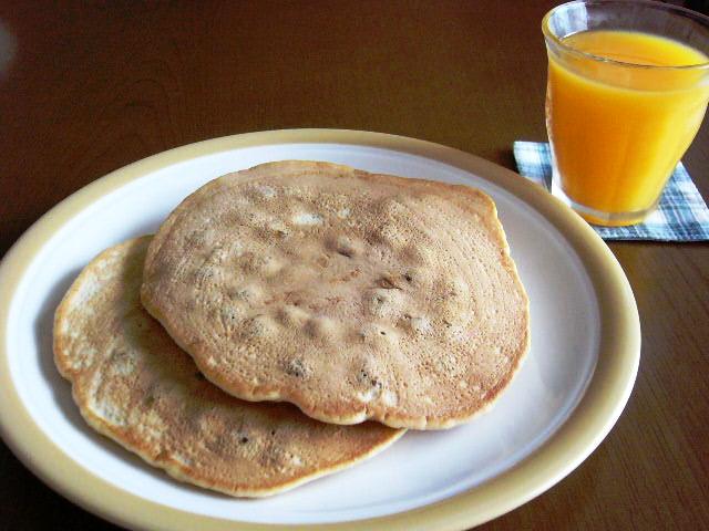 干し葡萄入りホットケーキ、オレンジジュース