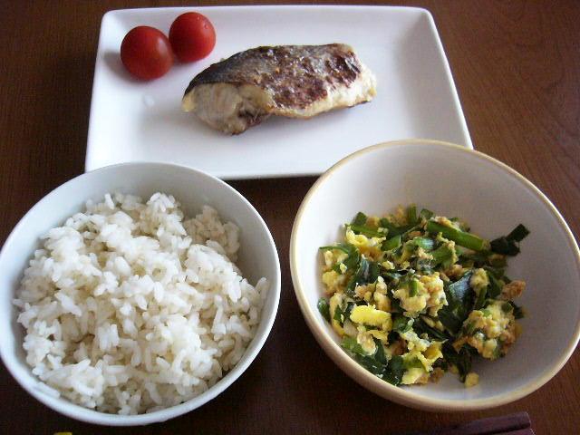 ミニトマト、魚の味噌漬け、七分つき米、ニラの卵とじ