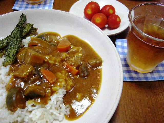 カレー、ゴーヤの素上げ、ミニトマト