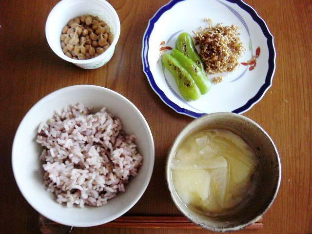 納豆、ピーマンソテー、ちりめんじゃこの佃煮、雑穀入り七分つき米、味噌汁