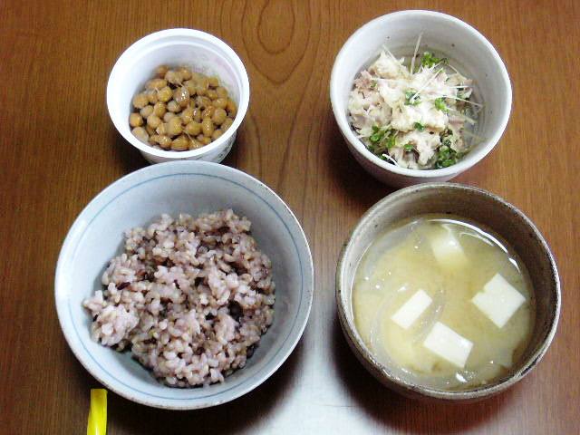 納豆、大根とツナのサラダ、雑穀入り玄米、味噌汁