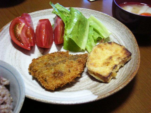 トマト、レタス、アジフライ、さつまいもの天ぷら、雑穀入り玄米、味噌汁