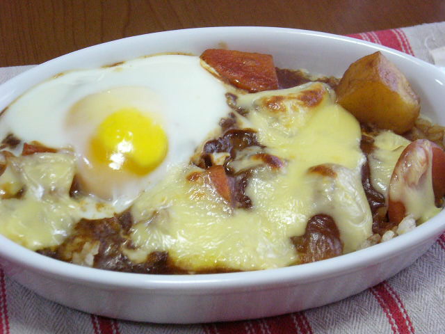 昨夜のカレーに卵とチーズを追加。。