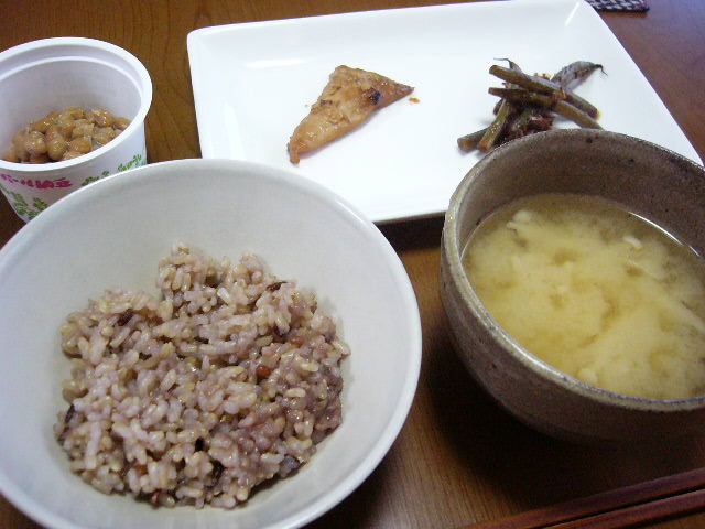 納豆、カワハギの味噌漬け、いんげんのくたくた煮、雑穀入り玄米、味噌汁