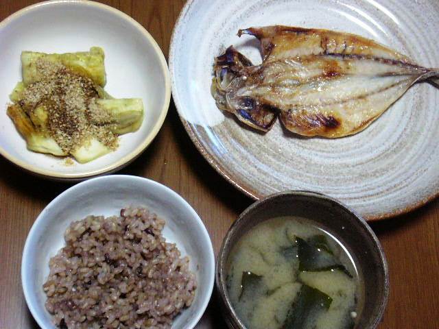 蒸し茄子、干物、雑穀入り玄米、味噌汁