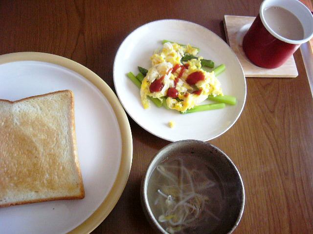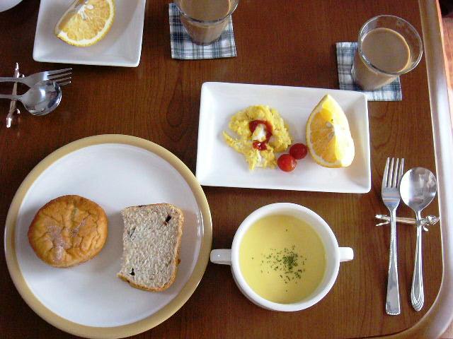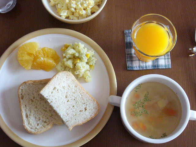 パン屋のアンパン、HBで作った胡桃と干しブドウのパン、スクランブルエッグ、ミニトマト、甘夏、コーンスープ、カフェオレ