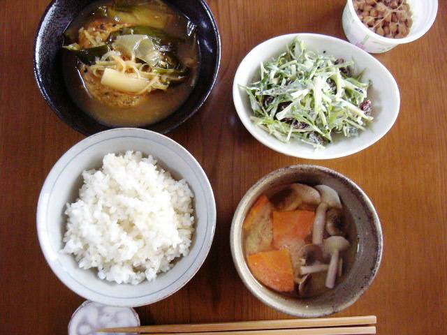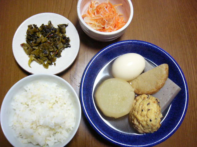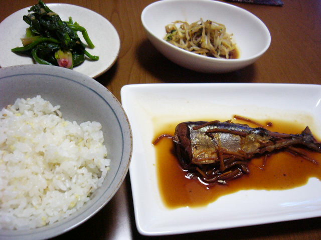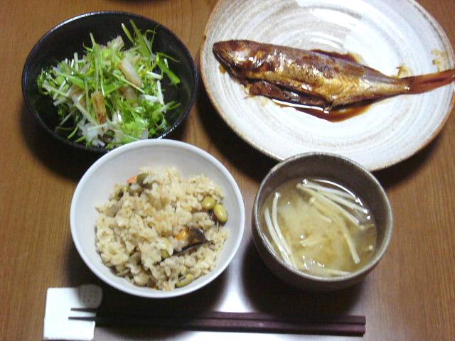 サラダは、テレビで見た大根ステーキの作り方をマネしました。ただ大根が残り少なかったので、小さく刻んで水菜に混ぜ込んでサラダにしました。大根を煮て、胡麻油で焦げ目がつくように焼いて、大根おろしと水菜を乗せ、ポン酢をかける・・・今度はちゃんと作ってみたい。あとしめじが余ってたので、久しぶりに炊き込みご飯に。大豆と昆布を入れるのが好きです。魚はホントは揚げる予定だったんですが・・・夫の帰宅が遅かったので、煮魚に予定変更(少しでも体に優しいほうがいいかなと)。こんなんばっかりだわー・・