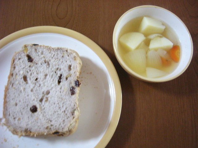 レーズンと胡桃入りパン(HB作)、野菜スープ