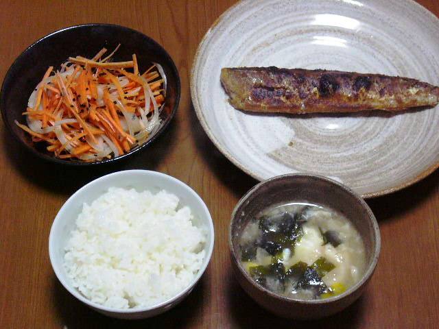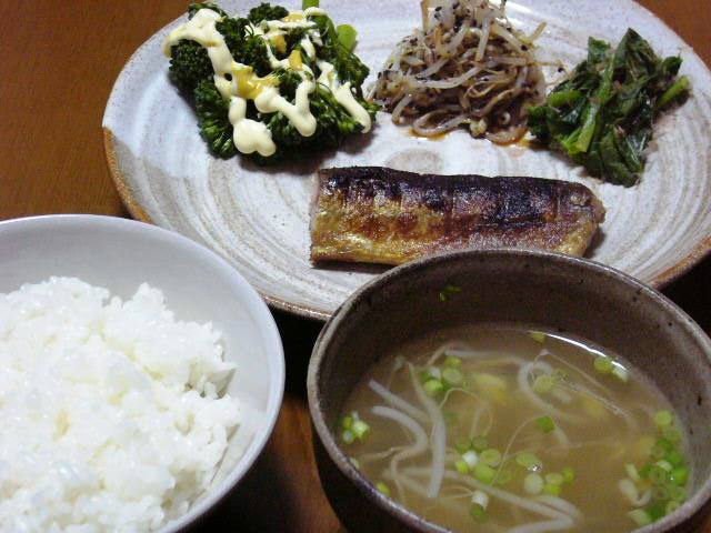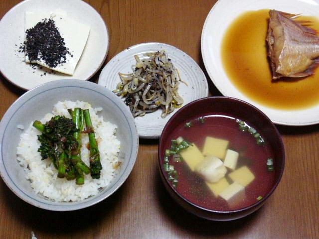 菜の花の炒め物は、胡麻油で炒めて酒と醤油をたらし、鰹節をまぶしてご飯に乗っける・・・と本に書いてあったのですが、おいしー!また作ろうと思いました。お吸い物は、煮付けに使った鯛の頭と昆布で出汁を取ってみました。少し遅めの夕食だったので、心持ち軽めの献立です。