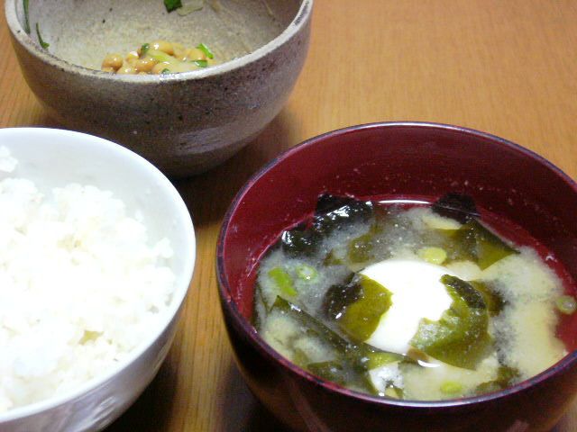 ネギ入り納豆、白米、卵とワカメの味噌汁、(写真には写ってないけど)きな粉餅