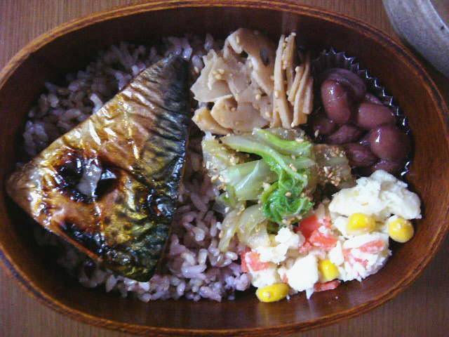 中身は、自家冷凍(前夜に冷凍庫から冷蔵庫に移動していた)のレンコンのキンピラと金時豆の甘煮、昨日の晩ごはんの残りのポテトサラダと白菜の塩漬け、もう食べないといけない塩サバ、雑穀入り玄米&七分付き米。見事に余り物ばかりです。