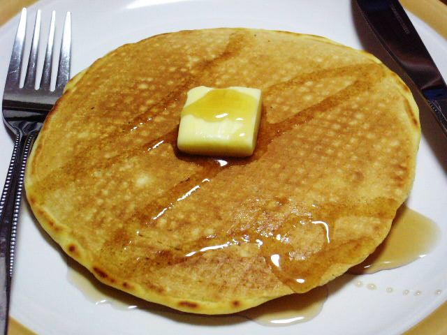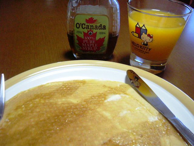 自家冷凍のパンケーキ、オレンジジュース
