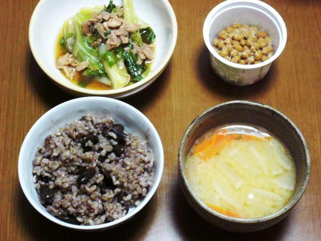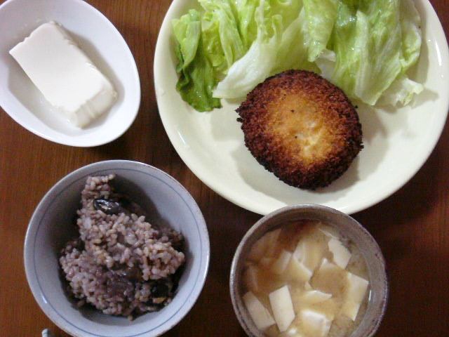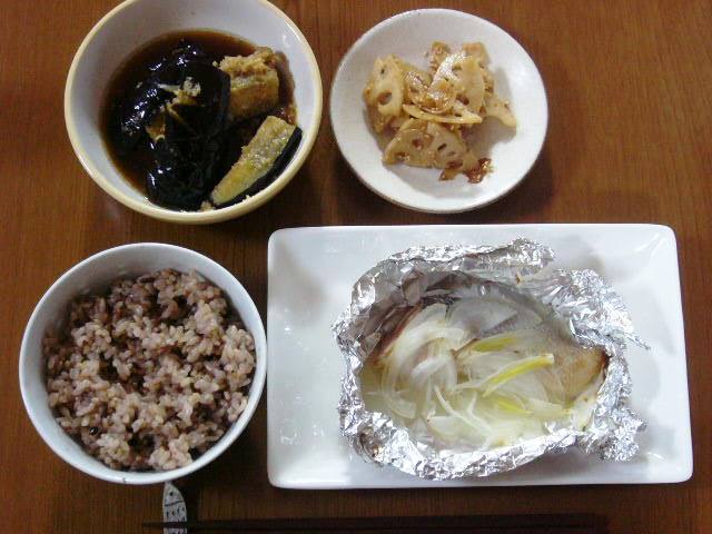 茄子の揚げびたし、レンコンのキンピラ、黒豆と雑穀入り玄米、鮭のホイル焼き