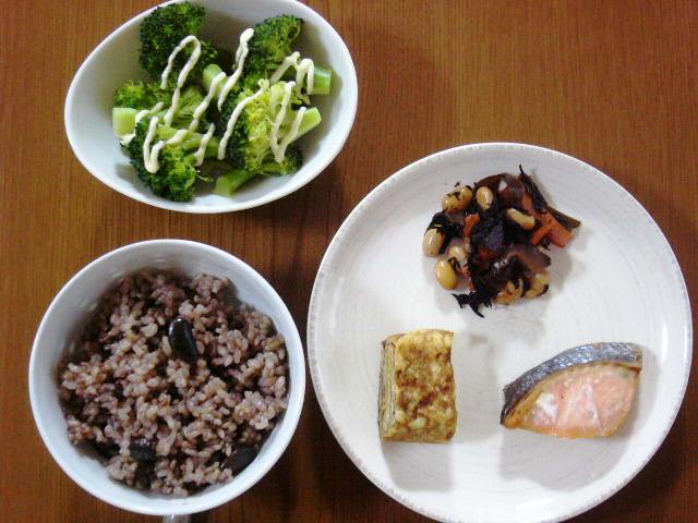 蒸したブロッコリー、レンコンのキンピラ、雑穀入り玄米、みりん干し