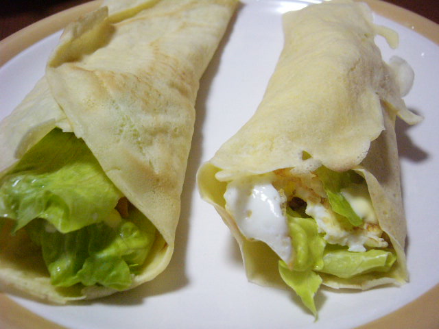 クレープの中身は、レタス・ツナ・目玉焼き+マヨネーズ。おいしいんだけど・・・クレープ生地いらないかも??なんかちぐはぐな感じ。