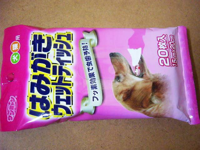 今使ってる歯磨き製品。20枚で300円弱。使い勝手は良いのですが、将来的には布に切り替えたい。。あと人間用の歯ブラシも時々使ってます。