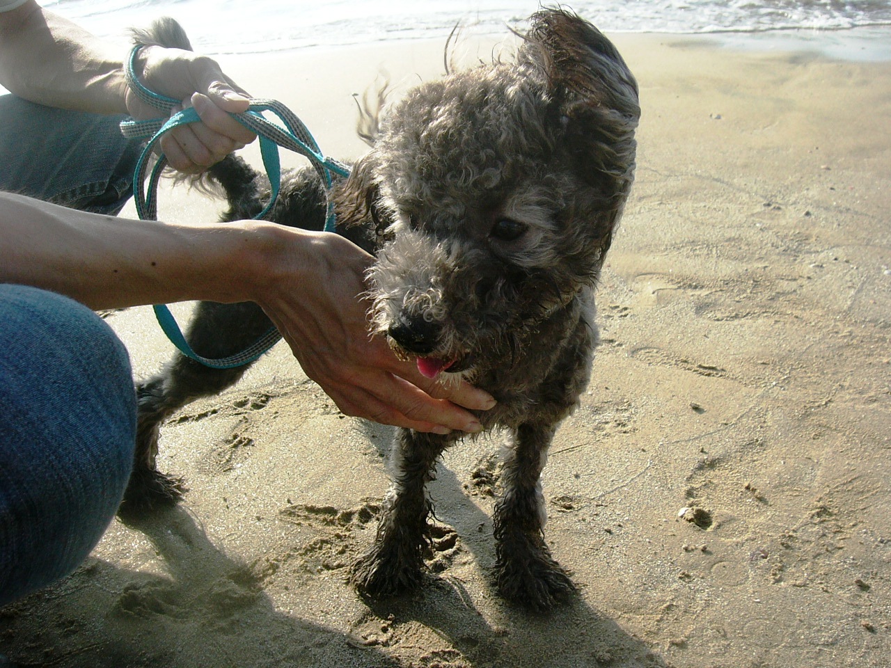 ちょっと離れた所では、海で泳いでる犬がいて、くうもプードルだからひょっとして泳ぐかも?!と思ったけど、今まで練習したことがないので(今までシャンプーも全てシャワー)、まぁムリでした。足の半分くらいまで水に浸かって、波がきたらうおっと驚いて後ずさる。そんな感じ。