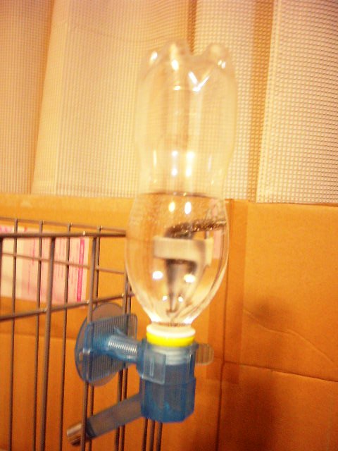 水は給水ボトルを使ってます。ほんとは食器にしたいけど、くうの飲み方が下手で、アゴに水を大量につけるので周りの床が水浸し→しかもその上でこける。という事情により、ボトルです。しつけの先生に確認したら「問題ないですよ~」と言われたけど・・・