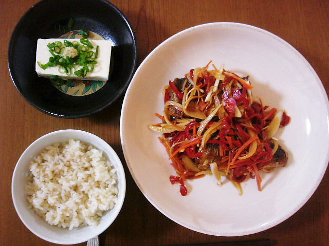 トビウオのグラタンもどき。トビウオは淡白なので、刺身か揚げて食べるのが多いらしいです。「でも連続で揚げるのもなぁ・・・」と本をめくってたら、「さんまにマヨネーズを塗ってトースターで焼く」というのが載ってて、「コレにしよう!」と思った筈なのに、何故かグラタン風に。上にブツブツ見えるのは、タルタルソースで、チーズも乗ってます。下には野菜がごろごろ。ちなみにグラタンも私が好きで夫が嫌いなメニューでーす。