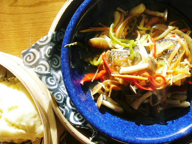 作りたくない時のご飯(冷凍してた物を蒸篭で蒸しただけ)。とろろ昆布の吸い物は、器にとろろを入れ、お湯を注ぎ、塩と醤油で味付け・・・と本に書いてありました。が、それだけでは以前試して味がしなかったので、昆布やらをミルサーで粉末にしたものを入れてみたりしました。うーん・・・本物を食べたことがないので(?)、正解の味がよくわかりません。。