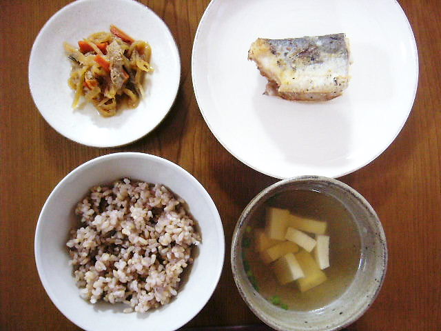 魚は野菜あんかけにしようと思ってたけど、食べ切れなさそうなので塩焼きに。吸い物は、昼間魚を3枚におろした時に、骨と昆布でスープを取ってみました。夜はヘルシーで量少なめがいい(年寄りみたいだな)。