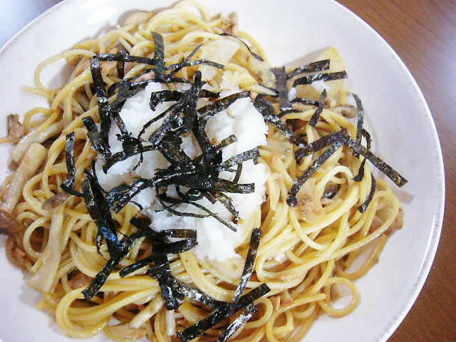 和風(?)パスタって、あんまり食べたことがないので、よくわからないです。和風パスタのイメージで、海苔と大根おろしを乗せましたが・・・バター醤油に普通乗せるものかなぁ?(さっぱりはしたけど)。