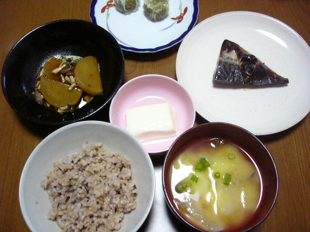 ホウレン草入りシュウマイ、大根の煮物きのこあんかけ、蒸し豆腐、さばみりん、雑穀入り玄米、ジャガイモとタマネギの味噌汁。