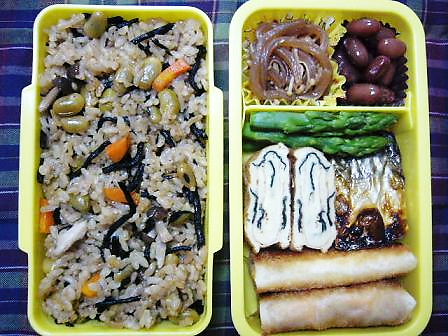 ひじきご飯は、材料を全部ぶっ込んで炊くだけ。豆は、みどり豆(青大豆というのかな?)です。